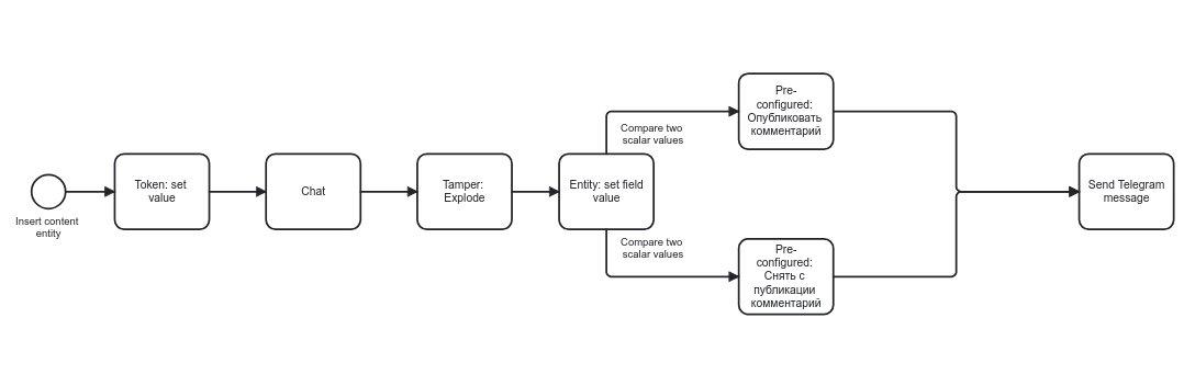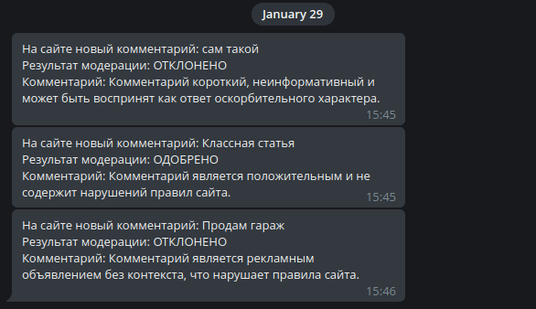 А поскольку нейросетям еще доверяют не все, мы добавили интеграцию с нашим модулем eca_tg и отправляем в телеграм уведомление о новом комментарии и решении, принятом искусственным интеллектом.